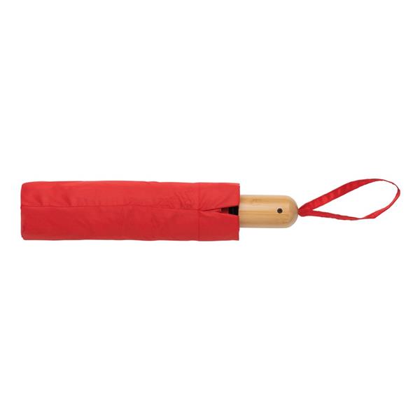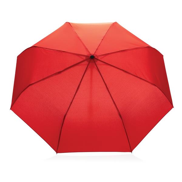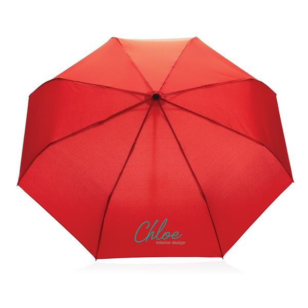 Parasol 21″ sztormowy, automatyczne otwieranie i zamykanie, metalowa rama, żebrowanie z włókna szklanego, bambusowy uchwyt, panele wykonane z 7,5 poddanych recyklingowi butelek PET (500 ml), dzięki zastosowaniu technologii fizycznych znaczników AWARE™ wykorzystane materiały są identyfikowalne z pochodzenia, 2% wpływów z każdego sprzedanego produktu z kolekcji Impact jest przekazywane na rzecz Water.org