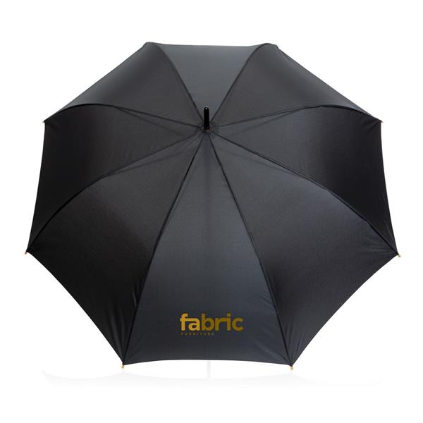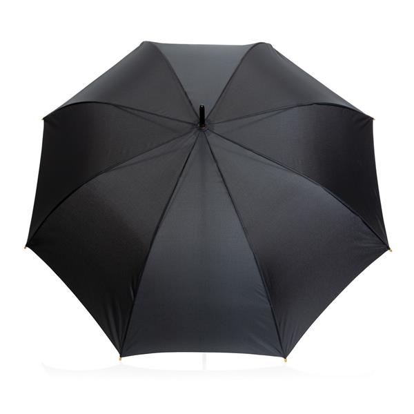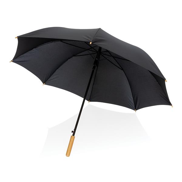 Parasol 27″, automatyczne otwieranie, bambusowy uchwyt, metalowa rama, żebrowanie z włókna szklanego, panele wykonane z 10,7 poddanych recyklingowi butelek PET (500 ml), dzięki zastosowaniu technologii AWARE™ wykorzystane materiały są identyfikowalne z pochodzenia, 2% wpływów z każdego sprzedanego produktu z kolekcji Impact jest przekazywane na rzecz Water.org