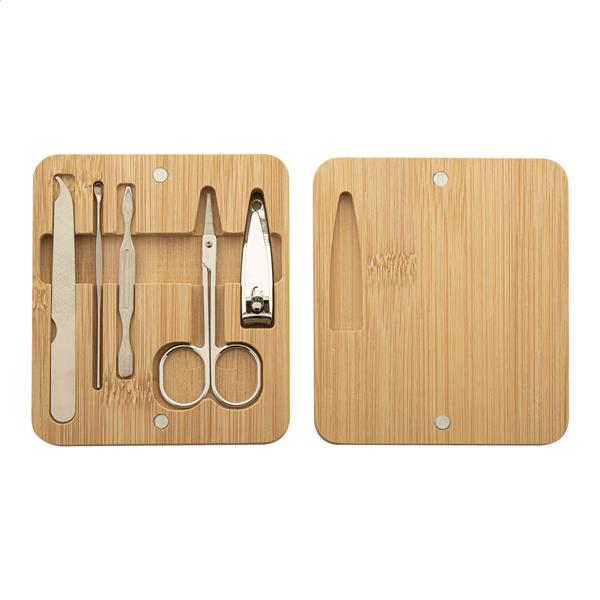 5-częściowy zestaw do manicure ze stali nierdzewnej w bambusowym etui z magnetycznie zamykaną pokrywką. Zawiera nożyczki, obcinacz do paznokci, pilnik do paznokci i 2 przyrządy do usuwania skórek.