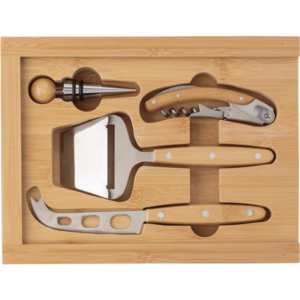Bambusowy zestaw do sera i wina, korkociąg, zatyczka do butelki, łopatka i nóż do sera, bambusowe pudełko