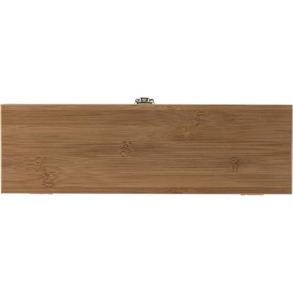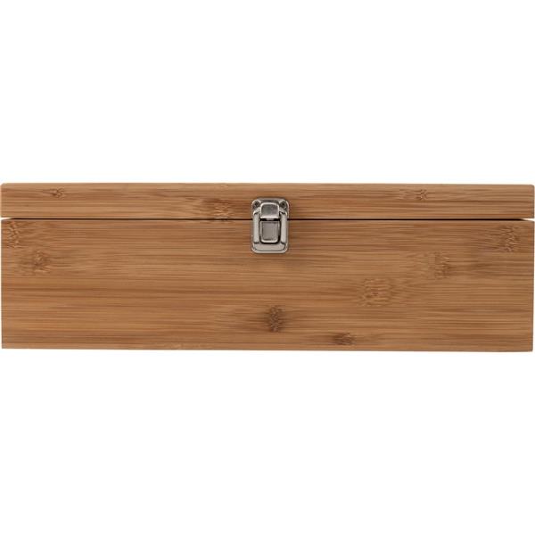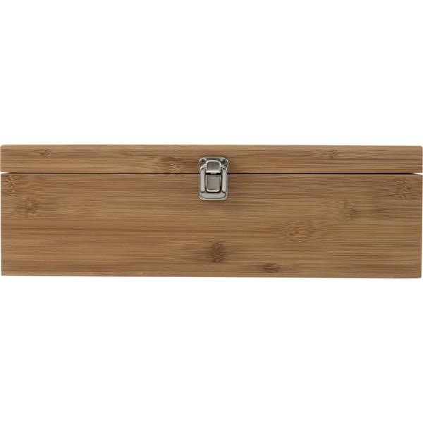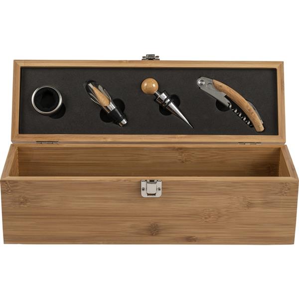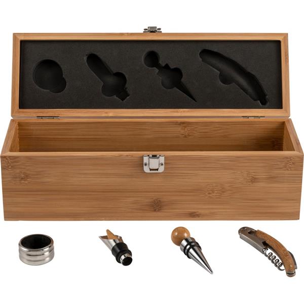 Zestaw do wina, 4 el. w bambusowym pudełku, akcesoria do wina: pierścień, nalewak, korek oraz korkociąg, z bambusowymi elementami