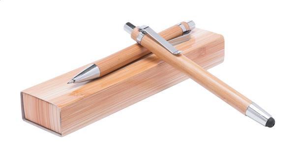 Bambusowy zestaw piśmienniczy. Długopis z końcówką do ekranów dotykowych i ołówek mechaniczny w pudełku prezentowym. Niebieski wkład i rysiki 0,7mm.