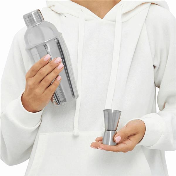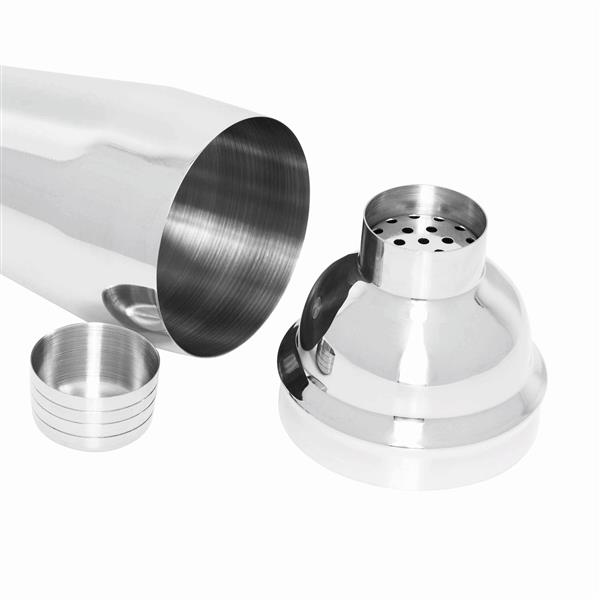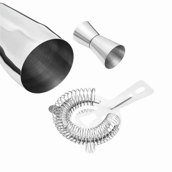 Zestaw barmański BARKEEPER składający się z shakera, pokrywki, sitka i jiggera. Ze stali nierdzewnej. Pojemność ok. 550 ml.