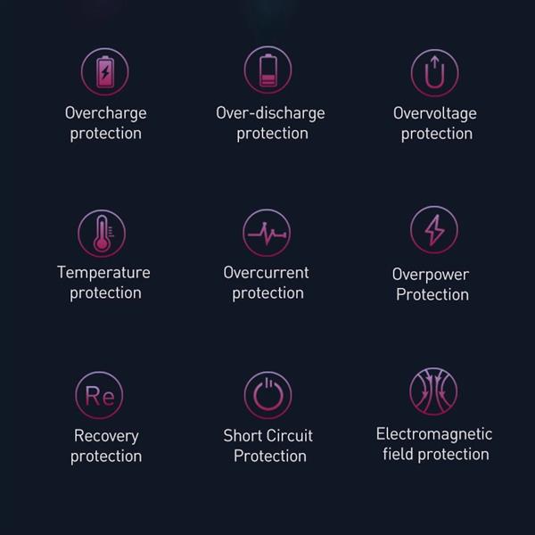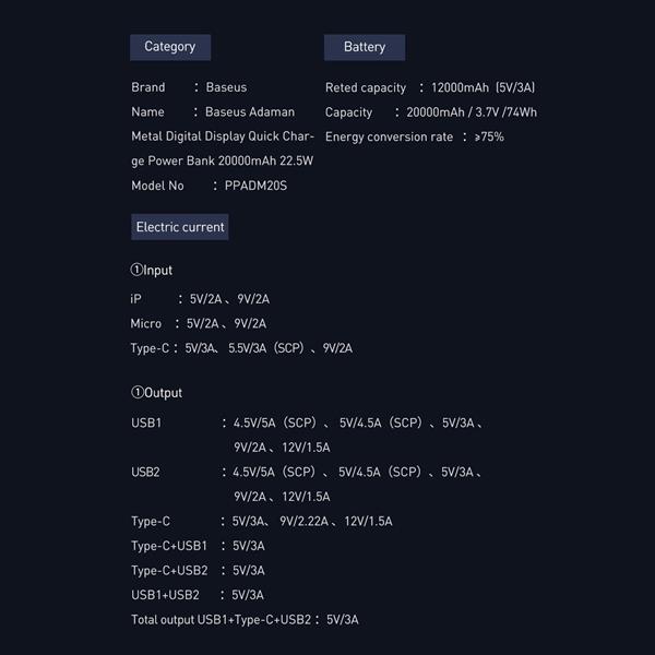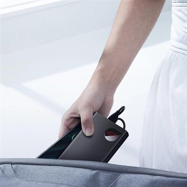 Powerbank marki Baseus obsługuje wiele standardów szybkiego ładowania m.in. SCP, Quick Charge 3.0, Power Delivery 3.0. Ma wbudowane 2 wyjściowe porty USB-A, port wejściowo-wyjściowy USB-C oraz porty wejściowe Lightning i Micro-USB. Produkt obsługuje prąd wyjściowy o maksymalnej mocy 22.5W. Ekran LED, który znajduje się na jego obudowie wskazuje wartość prądu z jaką aktualnie pracuje oraz poziom naładowania akumulatorów. Układ scalony obsługuje wiele zabezpieczeń, które chronią podłączone urządzenia przed uszkodzeniem.