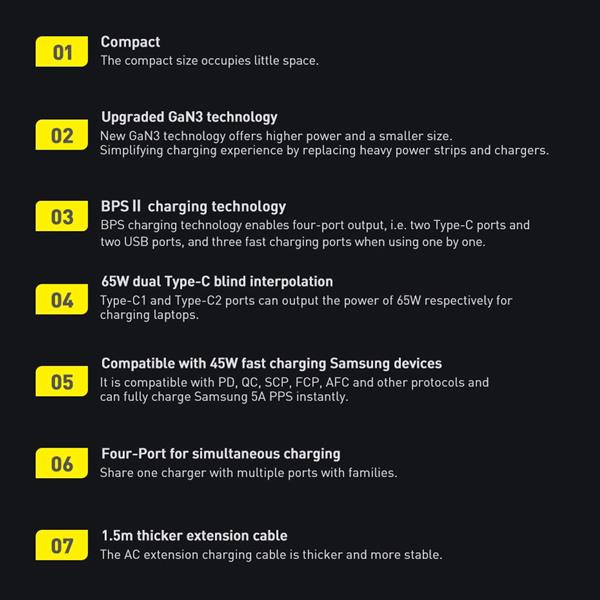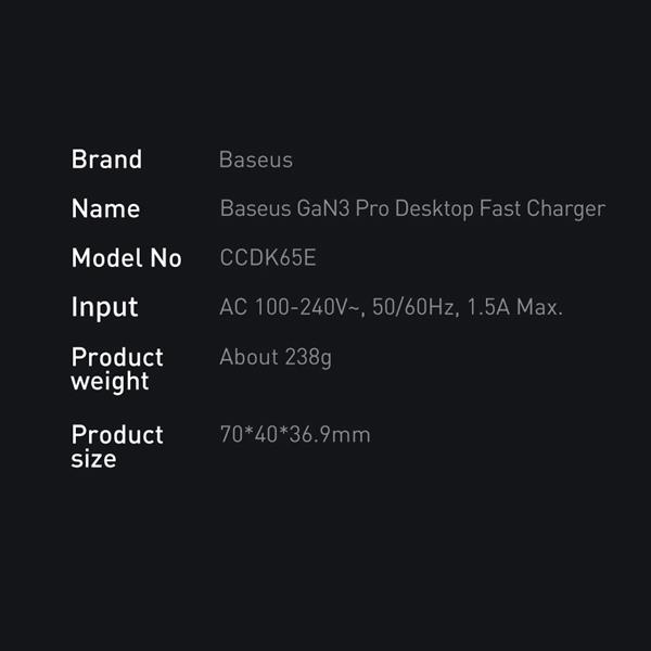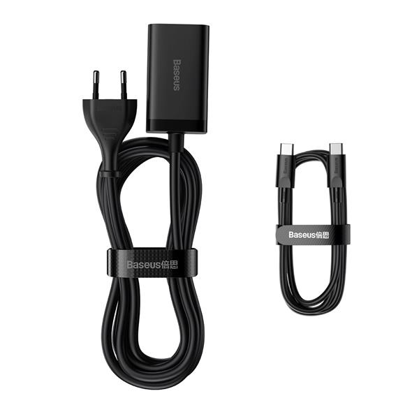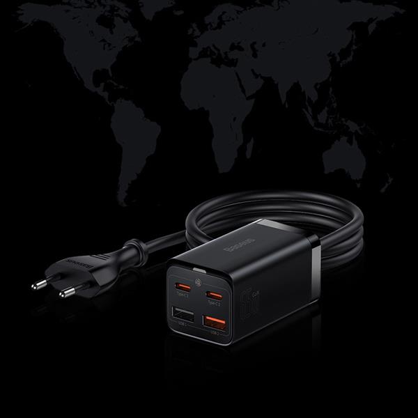 Baseus GaN3 Pro szybka ładowarka sieciowa GaN 2 x USB Typ C / 2 x USB 65W PD, QC4.0+, AFC, PPS + kabel USB Typ C – USB Typ C 1m czarny (CCGP040101)