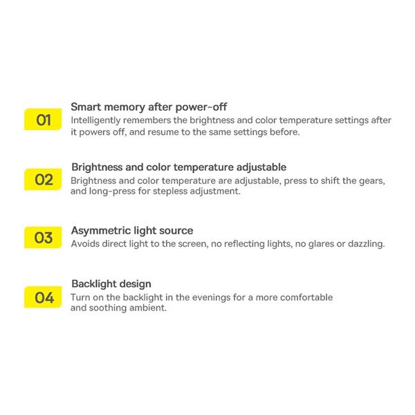 Brak oświetlenia w miejscu pracy lub źle dobrane i nieprawidłowo ustawione lampki biurkowe mogą powodować duży dyskomfort. Zapomnij o zmęczonych oczach, bólu głowy czy niewygodzie spowodowanej przez odblaski pojawiające się na ekranie. Wybierz i-wok Baseus – lampkę LED na monitor zaprojektowaną z myślą o użytku w domu lub w miejscu pracy.