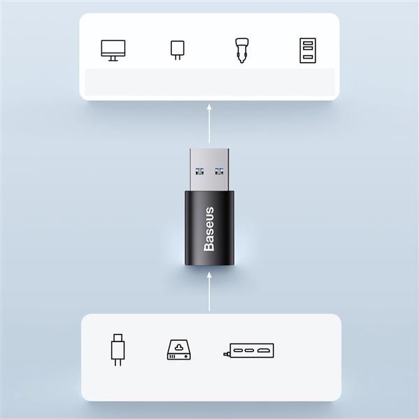Wyprodukowana przez firmę Baseus niewielka przejściówka ze złącza USB 3.1 na USB Typ C. Wykonany z wysokiej jakości materiałów praktyczny adapter umożliwiający podłączenie do zwykłego portu USB szeregu akcesoriów z wtyczką USB Typu C.