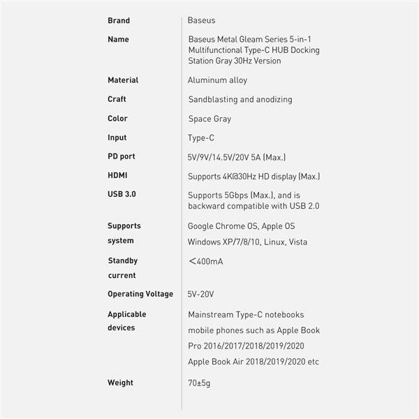 Baseus Metal Gleam Series multifunkcjonalny HUB USB 5w1 USB Typ C PD 100W HDMI szary (WKWG020013)