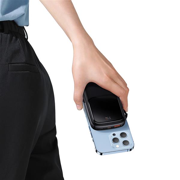 powerbank Baseus to produkt, który zaskoczy Cię swoim wykończeniem. Urządzenie jest małe i poręczne, lecz wyróżnia go spora pojemność – aż 10000 mAh. W bocznej części urządzenia znajduje się zwijany kabel typu USB-C, dzięki czemu możesz od razu podłączyć do niego swój telefon i rozpocząć ładowanie. Na uwagę zasługuje również uchwyt, przy pomocy którego możesz wygodnie przenosić powerbank lub dopiąć go np. do swojego plecaka.