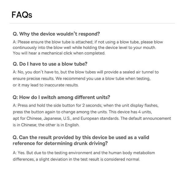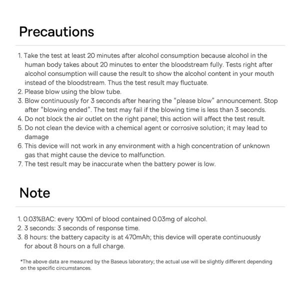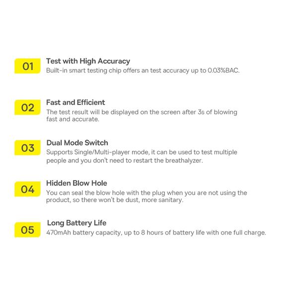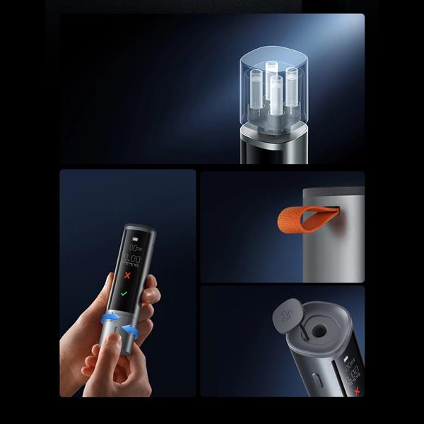 Mały i poręczny alkomat zabierzesz ze sobą wszędzie w kieszeni, torebce, plecaku, torbie, czy w schowku auta. Z nim będziesz się czuć o wiele pewniej. Urządzenie posiada wyświetlacz LED, który pokazuje stan naładowania i informacje odnośnie wykonanego pomiaru, z dokładnością do 0.03%. Zielona lub czerwona ikona informuje nas o obecności alkoholu w wydychanym powietrzu. Dodatkowo komendy głosowe i alerty dźwiękowe komunikują nam istotne informacje, czy pomiar został wykonany prawidłowo, kiedy zacząć dmuchać w ustnik. Wynik otrzymamy do 3s po zakończeniu procesu. W przypadku, gdy z urządzenia chciałyby korzystać inne osoby, to wystarczy jedynie przełączyć w tryb wielu użytkowników – nie ma konieczności resetowania alkomatu przed kolejną osobą. Wbudowana bateria 470mAh pozwala na 8h testowania. Z alkomatu można korzystać na dwa sposoby: bez ustnika lub z ustnikiem – większa dokładność pomiaru.