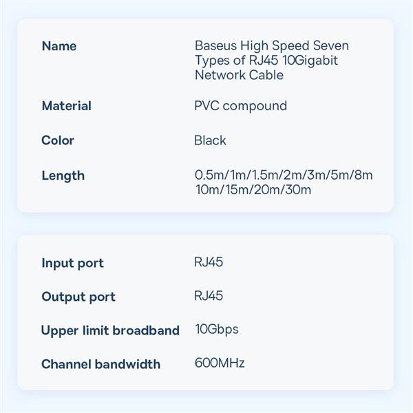 Patchcordy firmy Baseus wykorzystasz przy połączeniach urządzeń aktywnych i pasywnych w sieciach LAN, Ethernet, w przemyśle, domu i biurze. Przechodzą przez rygorystyczne testy aby sprostać wymaganiom kategorii 7. Zapewnia to wysokie parametry transmisji i prędkość przesyłu danych na poziomie 10 Gbps.
