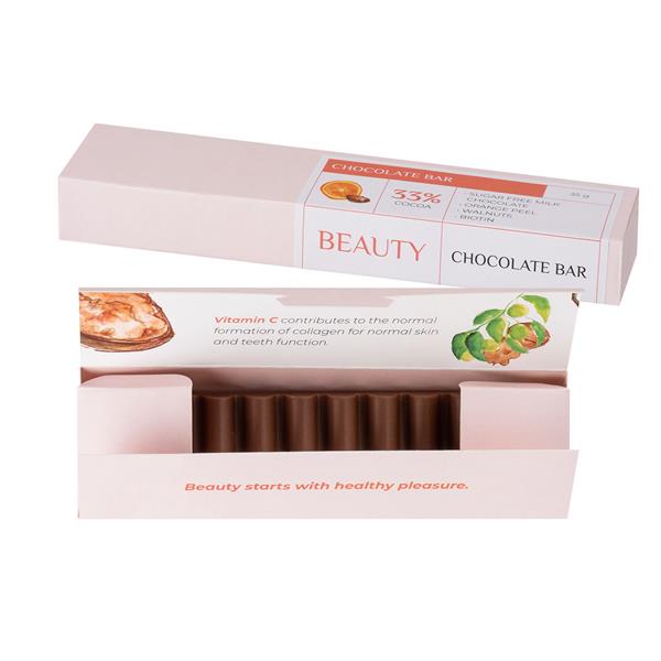 Batonik Czekoladowy Beauty Sugarfree 40 g – to czekoladowy batonik z dodatkiem skórki pomarańczowej oraz orzechów. W składzie produktu nie ma białego cukru.
