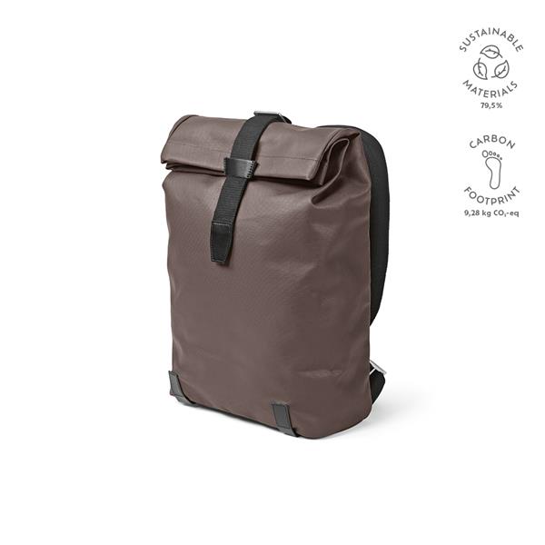 Ten wodoodporny plecak jest zgodny z zasadami zrównoważonego rozwoju: wykonany z bawełnianego płótna pochodzącego z recyklingu z powłoką PU (340 gr) i detalami z PU pochodzącymi z recyklingu. Z wyściełaną przegrodą na laptopa (17″) i 2 wewnętrznymi kieszeniami. Dostarczany w indywidualnej bawełnianej torbie z recyklingu.