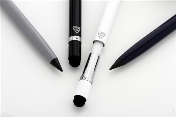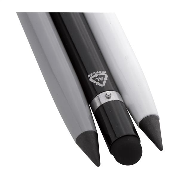 Długowieczny z recyklingu, aluminiowy długopis bezatramentowy z gumką do ekranu dotykowego i końcówką ze stopu metalu, która utlenia papier. Ten długopis pisze podobnie jak ołówek i jest również usuwalny. Posiada gumkę po wyjęciu rysika dotykowego.