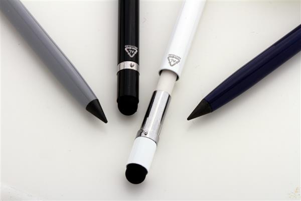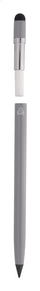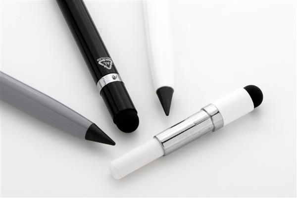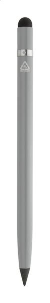 Długowieczny z recyklingu, aluminiowy długopis bezatramentowy z gumką do ekranu dotykowego i końcówką ze stopu metalu, która utlenia papier. Ten długopis pisze podobnie jak ołówek i jest również usuwalny. Posiada gumkę po wyjęciu rysika dotykowego.