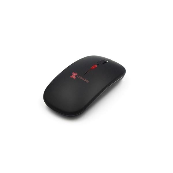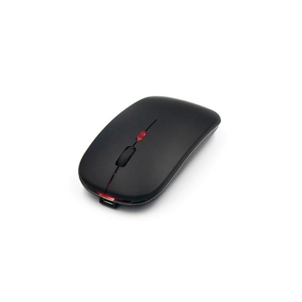 Bezprzewodowa mysz komputerowa, ładowana przez USB, bateria 500 mAh, czerwone podświetlenie, grawer ukazuje podświetlaną powierzchnię, wejście USB-C, kabel USB-C w komplecie