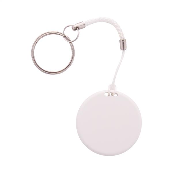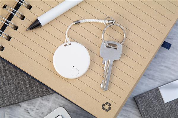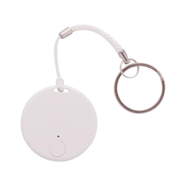 Bezprzewodowy lokalizator kluczy z migawką aparatu, w okrągłej obudowie z tworzywa sztucznego. Ze sznurkiem i metalowym brelokiem. Z baterią guzikową. Działa z bezpłatną aplikacją iOS / Android.