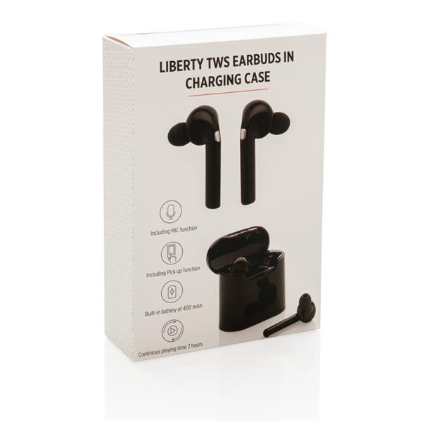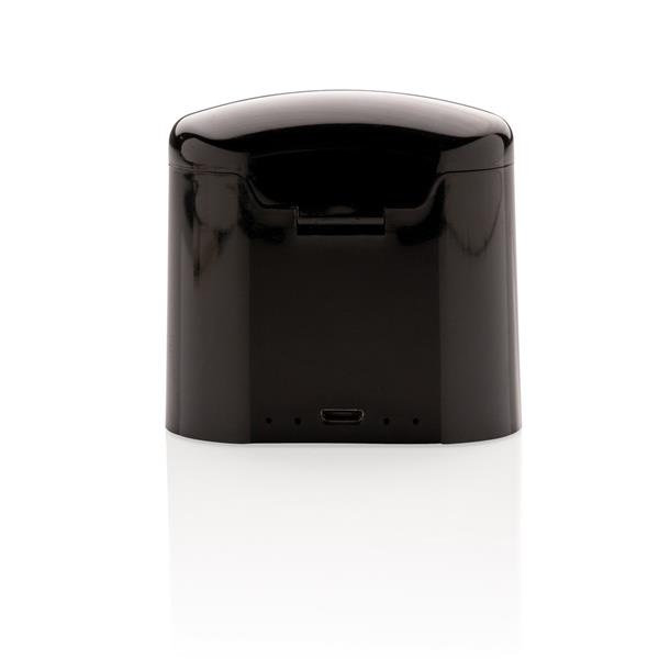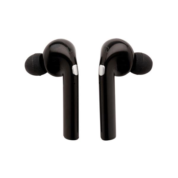 Bezprzewodowe słuchawki duszne, BT 5.0, wykonane z ABS, wbudowany mikrofon, etui z akumulatorem 400 mAh pełniące funkcję stacji ładującej w komplecie, akumulator słuchawek o pojemności 40 mAh umożliwia odtwarzanie muzyki na średnim poziomie głośności do 2 godzin, ponowne naładowanie za pomocą etui w 1 godzinę, zasięg do 10 m, 3 rozmiary nakładek dousznych w komplecie, ślad węglowy produktu: 0,84 kg CO2