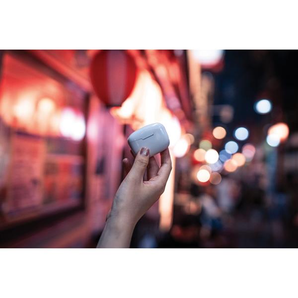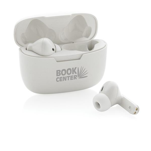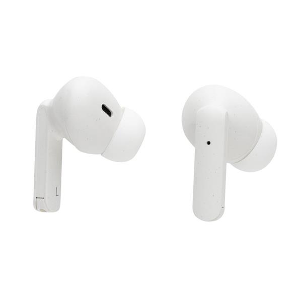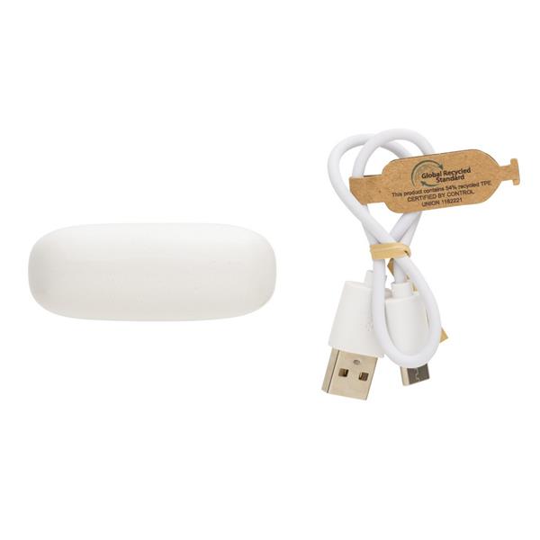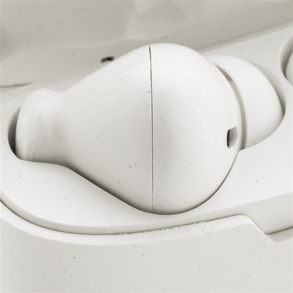 Bezprzewodowe słuchawki duszne, BT 5.0, wykonane z ABS z recyklingu z certyfikatem RCS, całkowita zawartość materiałów z recyklingu obliczona na podstawie wagi całkwitej produktu: 56%, wbudowany mikrofon, funkcja odbierania połączeń stereo, przycisk dotykowy, etui z akumulatorem 300 mAh pełniące funkcję stacji ładującej w komplecie, akumulator słuchawek o pojemności 35 mAh umożliwia odtwarzanie muzyki na średnim poziomie głośności do 3 godzin, ponowne naładowanie za pomocą etui w 1,5 godziny, zasięg do 10 m, 3 rozmiary nakładek dousznych w komplecie, kabel micro USB z TPE bez dodatku PVC w komplecie, ślad węglowy produktu: 0,57 kg CO2