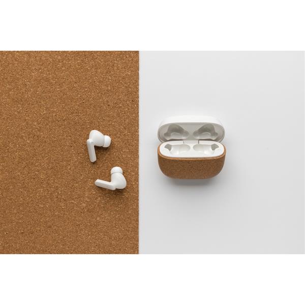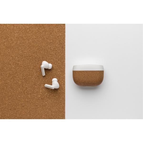 Douszne słuchawki bezprzewodowe TWS BT5.3, wbudowany mikrofon, funkcja odbierania połączeń, funkcja automatycznego parowania, czas odtwarzania na średnim poziomie głośności do 3 godzin, ponowne ładowanie w etui ładującym w ciągu 1,5 godziny, zasięg do 10 m, silikonowe wkładki o 3 różnych rozmiarach w komplecie, wykonane z korka z certyfikatem FSC® oraz ABS z recyklingu z certyfikatem RCS, całkowita zawartość materiałów z recyklingu obliczona na podstawie wagi całkowitej przedmiotu: 35%, kabel z TPE z recyklingu z certyfikatem RCS w komplecie, w pudełku z papieru kraftowego z certyfikatem FSC® mix, ślad węglowy produktu: 0,53 kg CO2