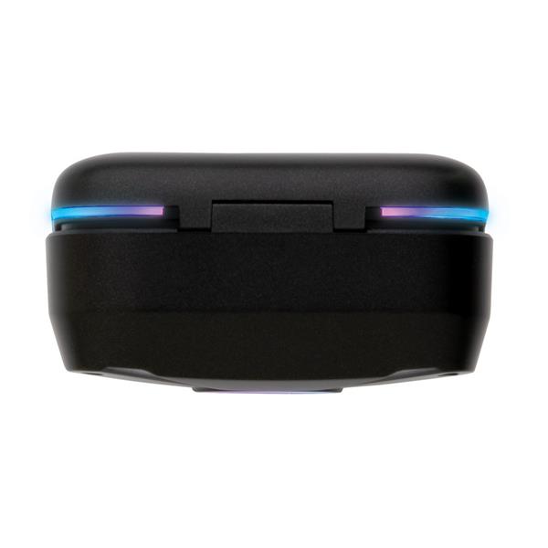 Bezprzewodowe słuchawki douszne BT 5.1 z systemem ENC (Environmental Noise Cancellation) dla krystalicznie czystych rozmów i połączeń, wbudowany mikrofon, funkcja odbierania połączeń, tryb niskich opóźnień dla graczy (60 ms), dotykowy panel sterowania, podświetlenie RGB z różnymi trybami oświetlenia, do 6 godzin odtwarzania na jednym ładowaniu, ponowne ładowanie słuchawek w 1 godzinę, etui ładującego w 2 godziny, wodoodporne IPX4 (całkowita ochrona przed spryskiwaniem i zachlapaniem wodą z różnych kierunków z natężeniem do 10 litrów na minutę), kabel oraz 3 dodatkowe nasadki w różnych rozmiarach w komplecie, nie zawiera PVC, ślad węglowy produktu: 0,82 kg CO2