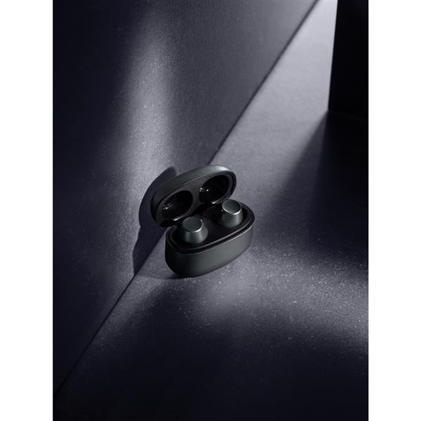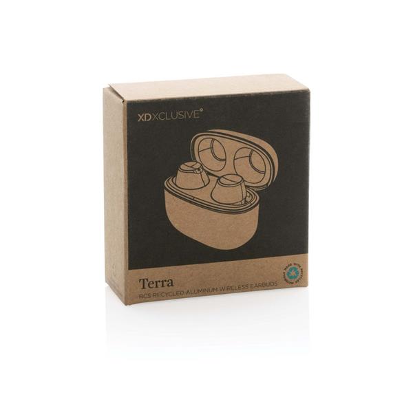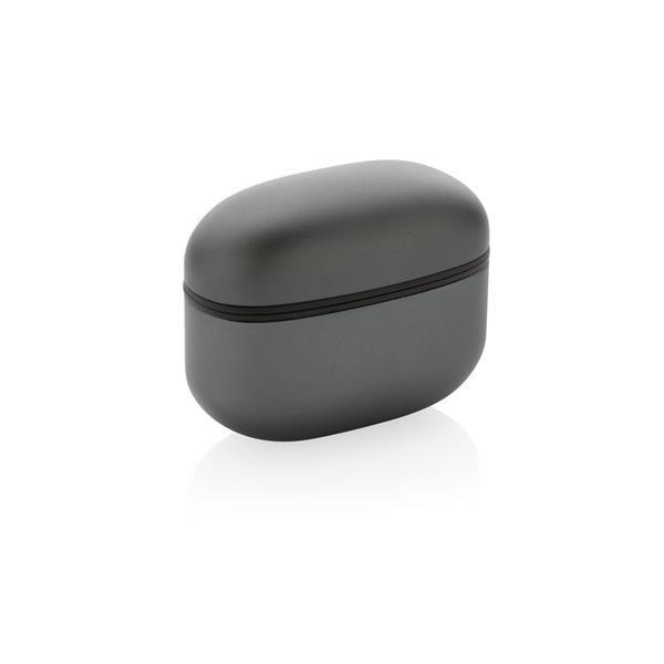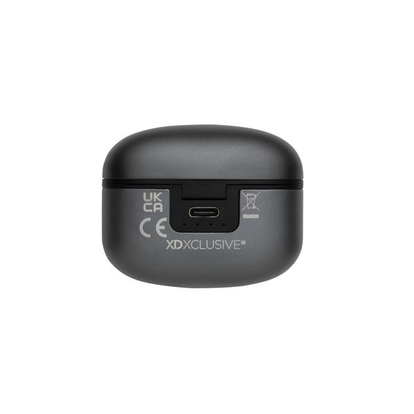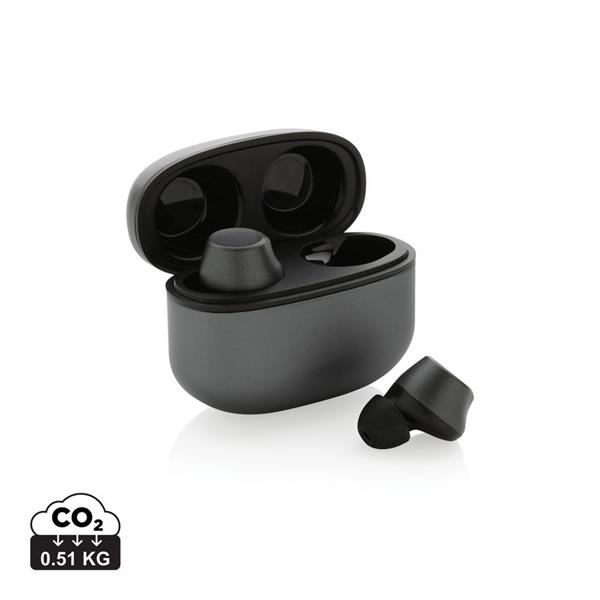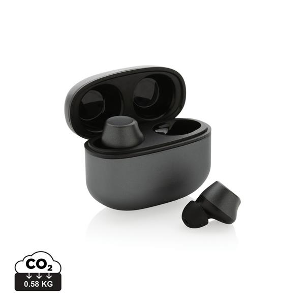 Bezprzewodowe słuchawki douszne BT 5.3, wykonane z aluminium z recyklingu i ABS, zawartość materiałów z recyklingu obliczona na podstawie wagi całkowitej przedmiotu: 64%, etui 300 mAh pełniące funkcję stacji ładującej w komplecie, akumulator słuchawek 40 mAh umożliwia odtwarzanie muzyki do 5 godzin, ponowne naładowanie za pomocą etui w 1.5 godziny, zasięg do 10 metrów, w pudełku z certyfikatem FSC® mix, kabel USB typu C wykonany z alumunium z recyklingu, TPE oraz PET w komplecie, nie zawiera PVC, ślad węglowy produktu: 0,51 kg CO2