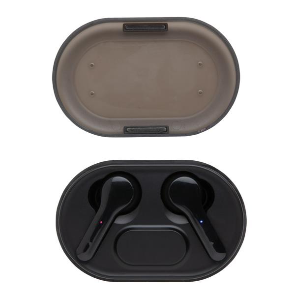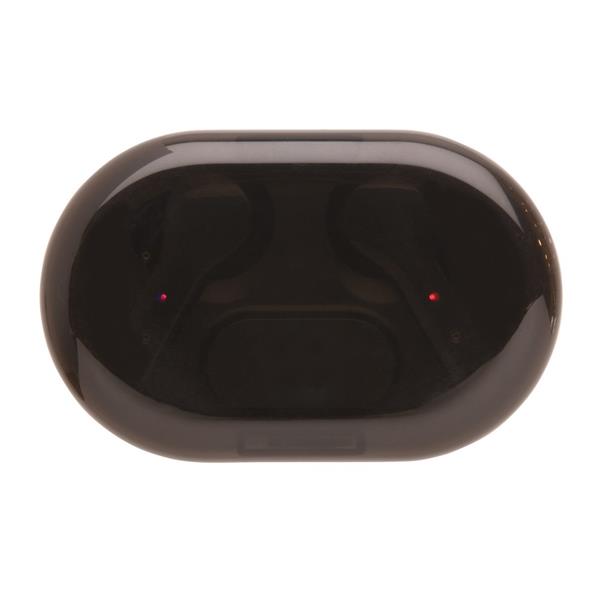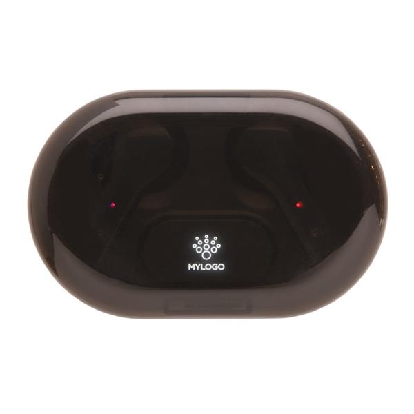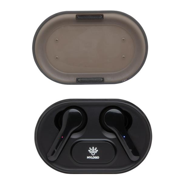 Bezprzewodowe słuchawki douszne TWS (True Wireless Stereo), BT 5.0, funkcja odbierania połączeń, muzyka oraz rozmowy telefoniczne stereo, etui z wbudowanym akumulatorem 300 mAh pełniące funkcję stacji ładującej w komplecie, grawer na stacji ładującej ukazuje podświetlaną powierzchnię, akumulator słuchawek umożliwia odtwarzanie muzyki do 3 godzin, ponowne naładowanie za pomocą etui w 1,5 godziny, zasięg do 10 metrów, 3 rozmiary nakładek dousznych w komplecie, kabel micro USB wykonany z TPE bez dodatku PVC w komplecie, ślad węglowy produktu: 0,74 kg CO2