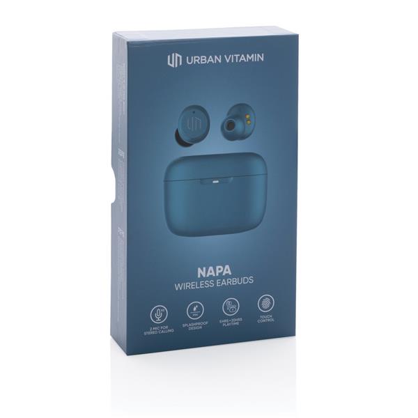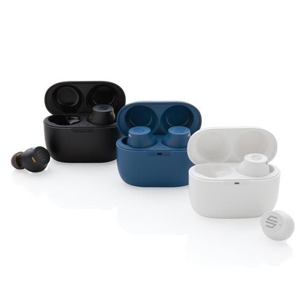 Bezprzewodowe słuchawki douszne, mocny i głęboki dźwięk, poziom redukcji szumów do 25 dB, wodoodporne IPX5 (całkowita ochrona przed strumieniem wody płynącej z różnych kierunków z wydajnością do 12,5 litra na minutę), dotykowy panel sterowania, wbudowany mikrofon, funkcja odbierania połączeń, do 5 godzin odtwarzania na jednym ładowaniu, etui ładujące zapewnia 18 godzin odtwarzania, nie zawiera PVC, opakowanie nie zawiera plastiku, ślad węglowy produktu: 1,02 kg CO2