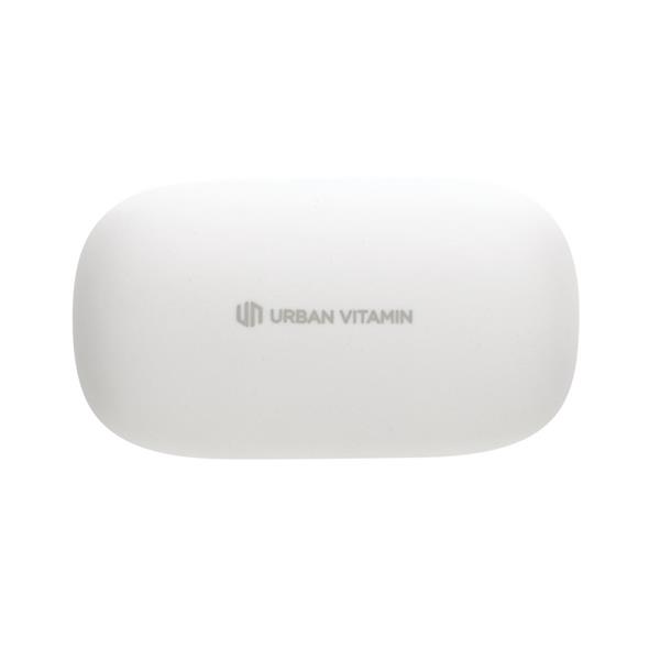 Bezprzewodowe słuchawki douszne, wykonane z ABS z recyklingu z certyfikatem RCS, całkowita zawartość materiałów z recyklingu obliczone na podstawie wagi całkowitej przedmiotu: 55%, funkcja redukcji szumów otoczenia podczas rozmów (ENC), wbudowane 2 mikrofony, funkcja odbierania połączeń, wodoodporne IPX4 (całkowita ochrona przed spryskiwaniem i zachlapaniem wodą z różnych kierunków z natężeniem do 10 litrów na minutę), dotykowy panel sterowania, do 6 godzin odtwarzania na jednym ładowaniu, etui ładujące zapewnia 20 godzin odtwarzania, nie zawiera PVC, opakowanie o zmniejszonej zawartości plastiku, ślad węglowy produktu: 0,66 kg CO2