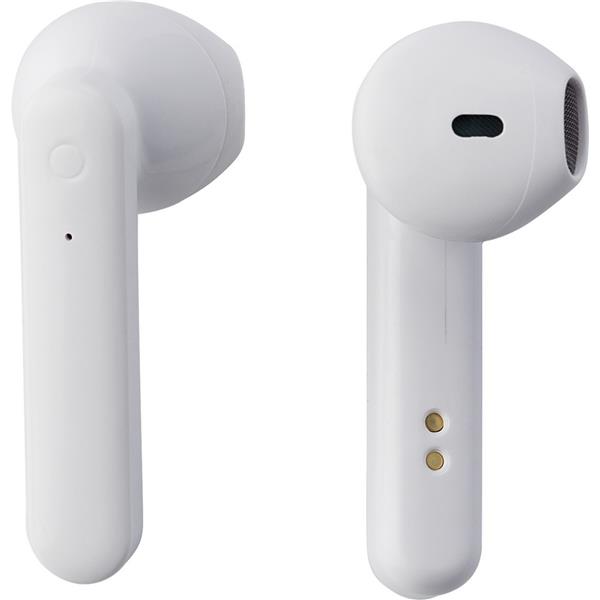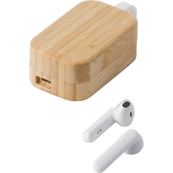 Bezprzewodowe słuchawki douszne, bambusowe etui, kabel ładujący w komplecie