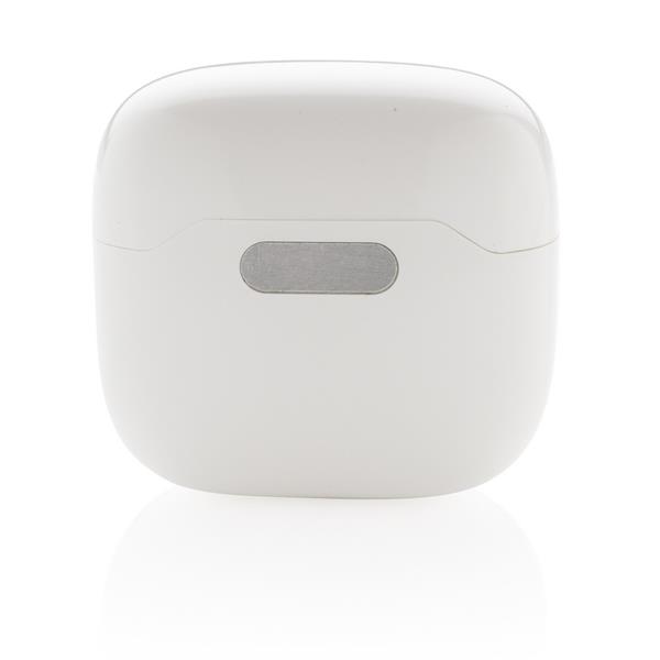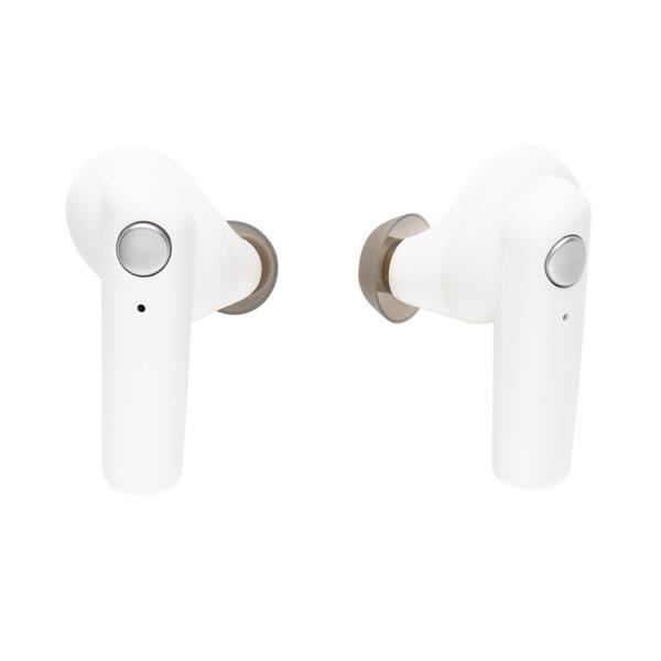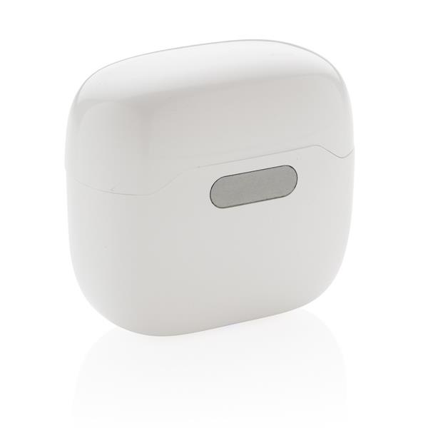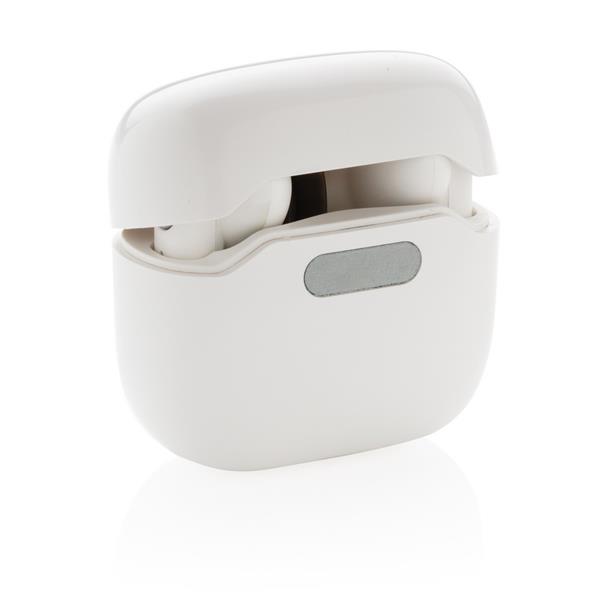 Bezprzewodowe słuchawki duszne, BT 5.0, wykonane z ABS, etui posiada funkcję sterylizacji, wbudowane diody UV-C zabijają do 99,9% bakterii, dzięki specjalnej konstrukcji po otwarciu urządzenia w trakcie sterylizacji światło wyłączy się automatycznie bez narażania użytkownika, długość fali UV-C 270nm-280nm, wbudowany mikrofon, funkcja odbierania połączeń stereo, przycisk dotykowy, etui z akumulatorem 300 mAh pełniące funkcję stacji ładującej w komplecie, akumulator słuchawek o pojemności 30 mAh umożliwia odtwarzanie muzyki na średnim poziomie głośności do 4 godzin, ponowne naładowanie za pomocą etui w 1,5 godziny, zasięg do 10 m, 3 rozmiary nakładek dousznych w komplecie, kabel micro USB z TPE bez dodatku PVC w komplecie, ślad węglowy produktu: 0,74 kg CO2