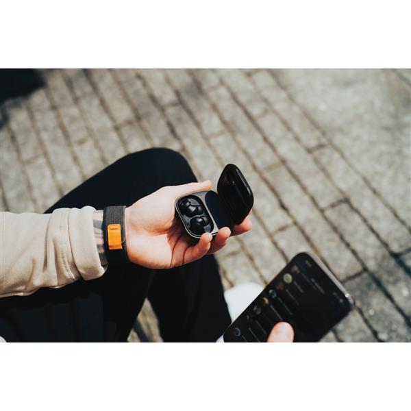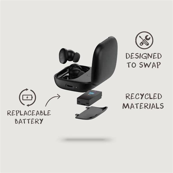 Bezprzewodowe słuchawki douszne, dzięki specjalnej konstrukcji słuchawki można łatwo rozebrać i naprawić, wymienna bateria, wodoodporne IPX5, posiadają funkcje ANC i ENC, wykonane z PC z recyklingu z certyfikatem RCS, 5 wbudowanych mikrofonów dla krystalicznie czystych rozmów, funkcja asystenta głosowego, funkcja odbierania połączeń, akumulator słuchawek umożliwia odtwarzanie muzyki do 6 godzin na jednym ładowaniu, całkowita zawartość materiałów z recyklingu obliczona na podstawie wagi całkowitej produktu: 36%
