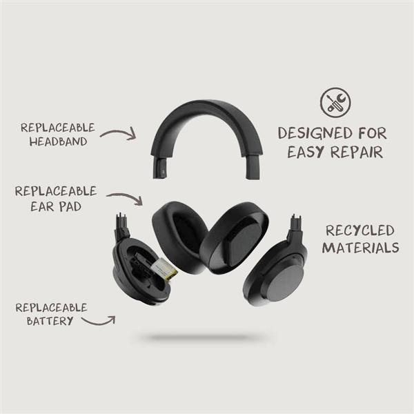 Bezprzewodowe słuchawki nauszne, dzięki specjalnej konstrukcji słuchawki można łatwo rozebrać i naprawić, wymienna bateria, pałąk oraz nauszniki, posiadają funkcje ANC i ENC, wykonane z PC z recyklingu z certyfikatem RCS, 5 wbudowanych mikrofonów dla krystalicznie czystych rozmów, funkcja asystenta głosowego, funkcja odbierania połączeń, akumulator słuchawek umożliwia odtwarzanie muzyki do 40 godzin na jednym ładowaniu, całkowita zawartość materiałów z recyklingu obliczona na podstawie wagi całkowitej produktu: 32%