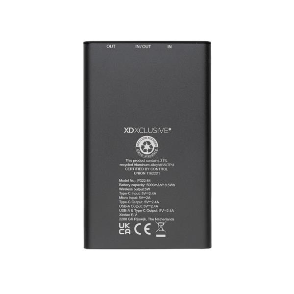 Bezprzewodowy power bank 5000 mAh, wykonany z aluminium i ABS z recyklingu z certyfikatem RCS, całkowita zawartość materiałów z recyklingu obliczona na podstawie wagi całkowitej przedmiotu: 28%, ładowarka bezprzewodowa 5W, diody wskazujące poziom naładowania, wbudowany akumulator litowo-polimerowy klasy A o dużej gęstości i trwałości, bezprzewodowe ładowanie jest kompatybilne ze wszystkimi urządzeniami posiadającymi możliwość ładowania indukcyjnego, wejście micro USB 5V/2A, wejście typu C 2.4a, wyjście typu C 5V/2.4A, wyjście USB 5/2.4A, w pudełku kraftowym z certyfikatem FSC® mix, bez dodatku PVC, ślad węglowy produktu: 2,47 kg CO2