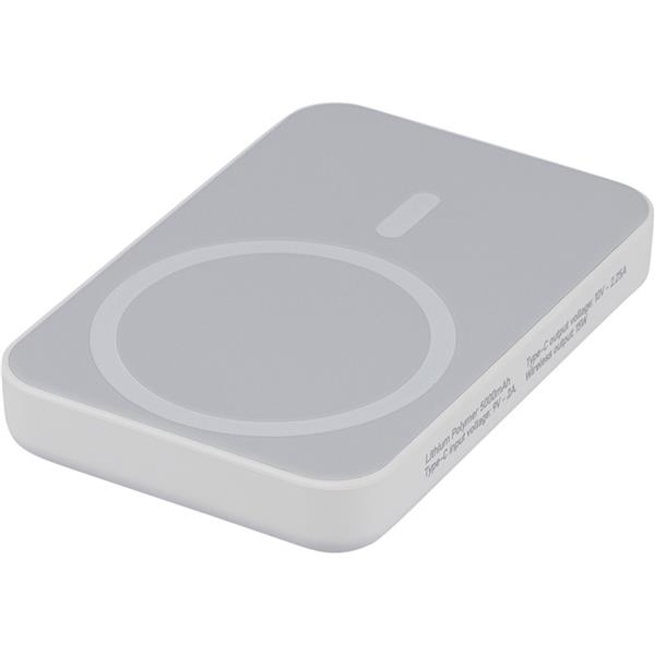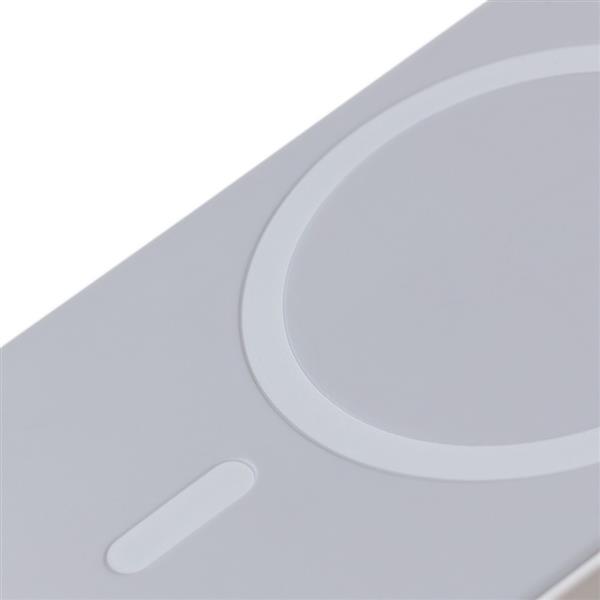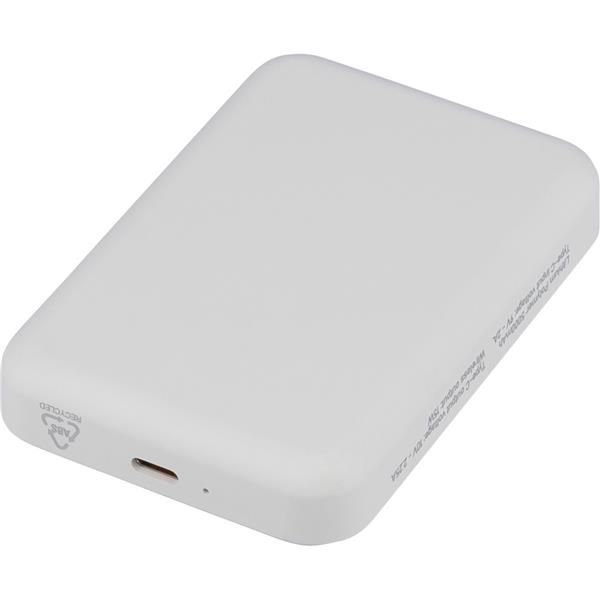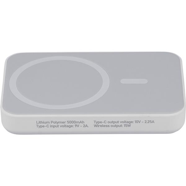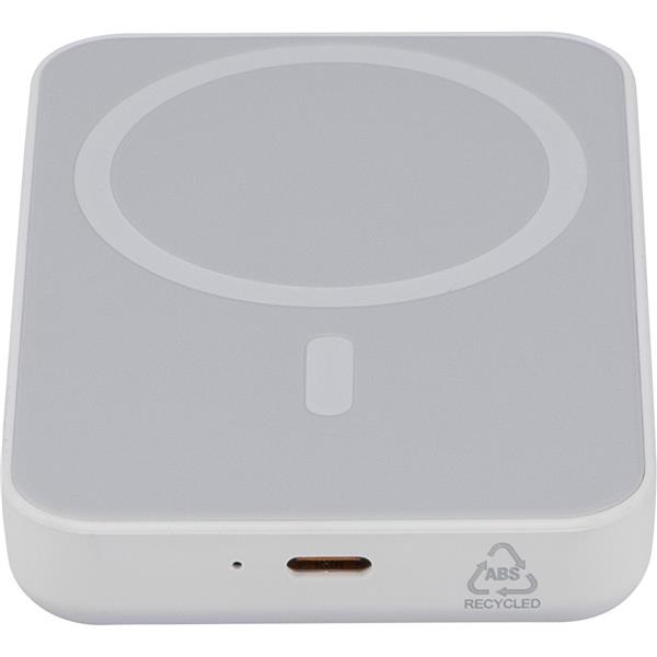 Bezprzewodowy Power Bank 5000 mAh, z wyjściem ładowania bezprzewodowego 15W, ładowanie przez końcówkę typu-C, wejście typu-C: DC 5V 3A, DC 9V 2A, wyjście typu-C: DC 5V 3A, DC 9V 2,22A, DC 12V 1,67A, zawiera ochronę przed przegrzaniem, zwarciem, przepięciem i nadprądem, zapakowany pojedynczo w brązowe pudełko kartonowe z papierowym wypełnieniem bez torebki foliowej, ikona RABS na produkcie, produkt wykonany z recyklingowego ABS z baterią litowo-jonową