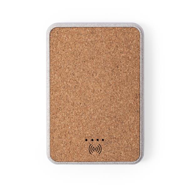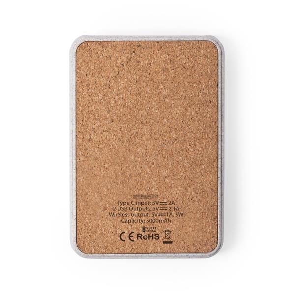 Bezprzewodowy power bank 5000 mAh, wykonany z włókien słomy pszenicznej, korkowy front, ładowarka bezprzewodowa 5W, działa z telefonami posiadającymi możliwość ładowania indukcyjnego, możliwość ładowania trzech urządzeń jednocześnie, 4 diody wskazujące poziom naładowania, 2 wyjścia USB 5V/2.1A, wejście USB typu C 5V/2A, kabel USB typu C w komplecie