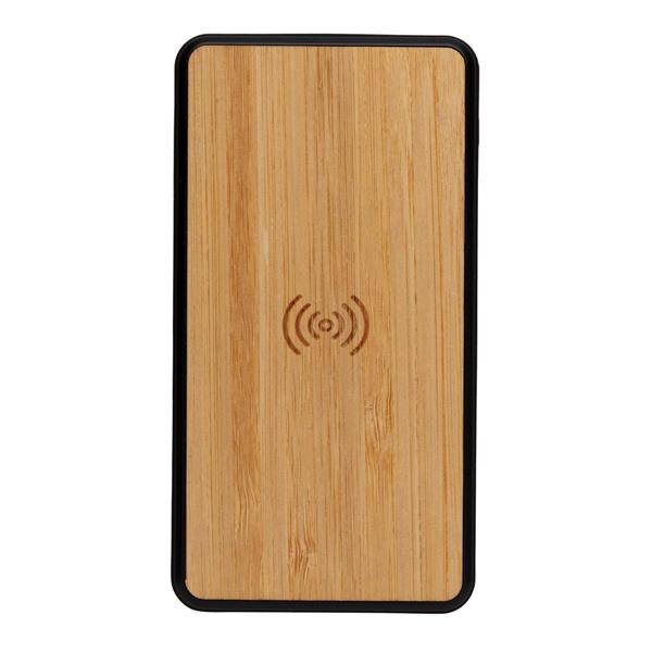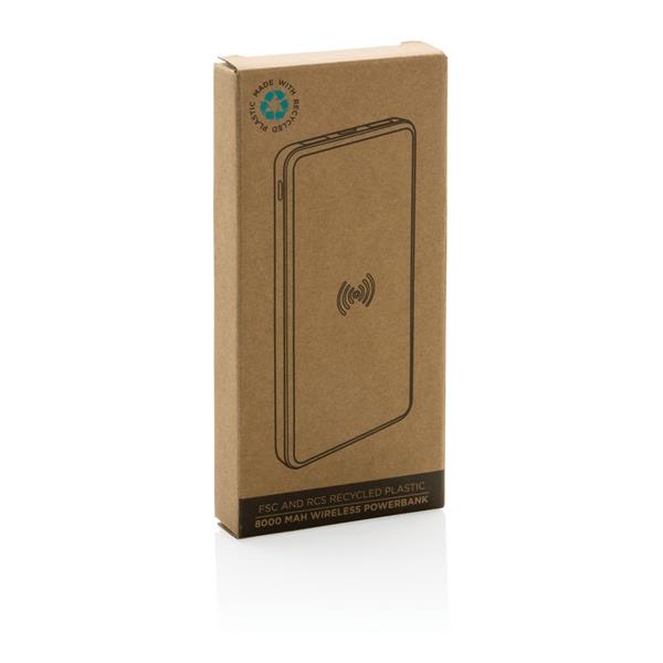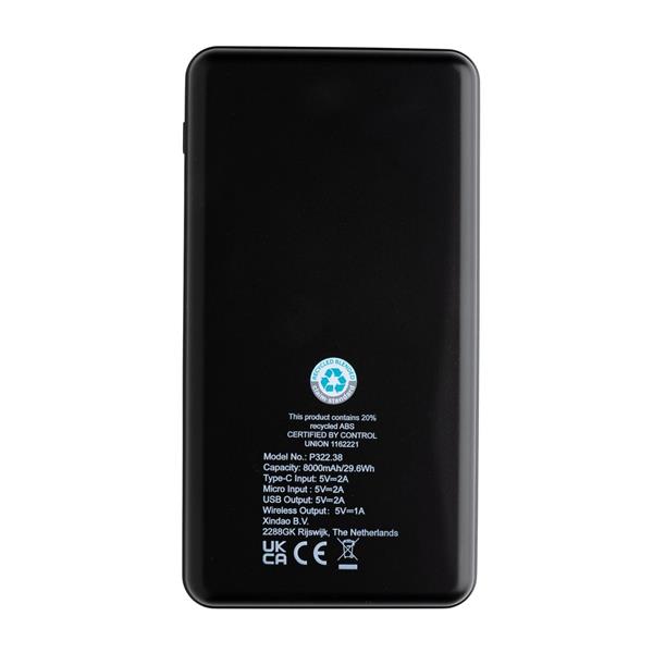 Power bank 8000 mAh, ładowarka bezprzewodowa 5W, działa z telefonami posiadającymi możliwość ładowania indukcyjnego, wykonany z ABS z recyklingu z certyfikatem RCS i bambusa z certyfikatem FSC®, całkowita zawartość materiałów z recyklingu: 20%, obliczona na podstawie masy całkowitej przedmiotu, wbudowany akumulator litowo polimerowy o wysokiej gęstości, wejście USB typu C 5V/2A, wejście micro USB 5V/2A, wyjście 5V/2.4A, w komplecie kabel z TPE z recyklingu z certyfikatem RCS®, ślad węglowy produktu: 3,34 kg CO2