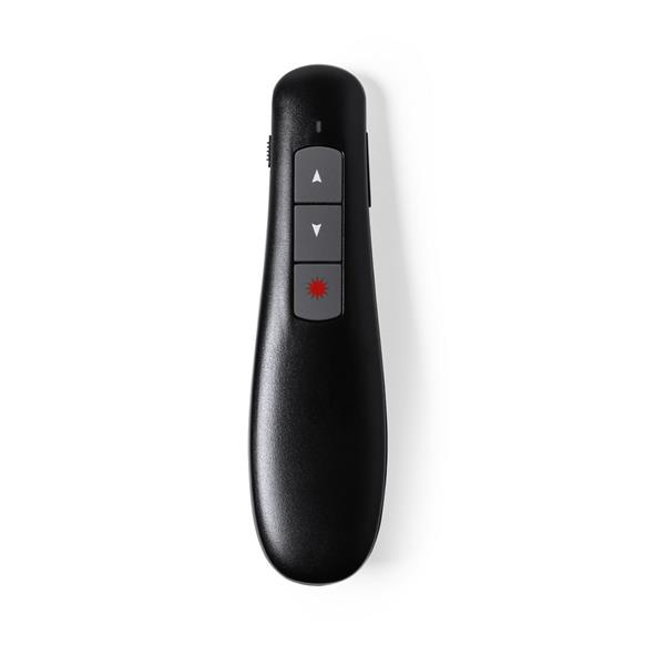 Bezprzewodowy wskaźnik laserowy, posiada przyciski do przełączania slajdów prezentacji/regulacji głośności/pauzy, odbiornik USB w komplecie