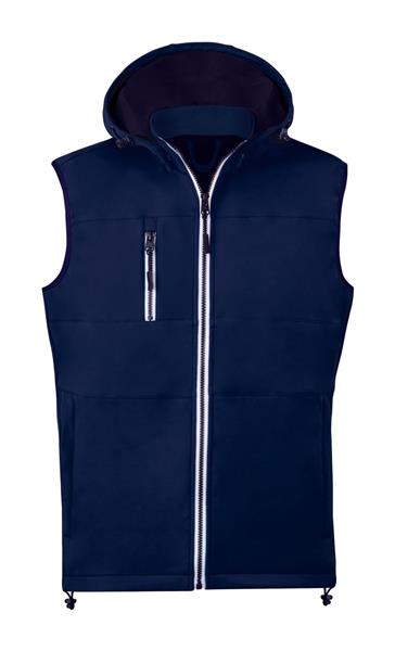 Wiatro i wodoodporna, zapinana na zamek kamizelka typu softshell z 2 kieszeniami bocznymi, 1 kieszenią przednią, kołnierzem ze stójką i odpinanym kapturem. 100% poliester, 300 g/m2.