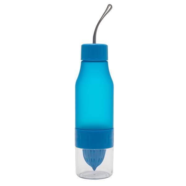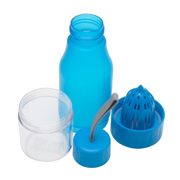 Wykonany z ABS, polipropylenu i poliwęglanu bidon 600 ml z wyciskarką do soków. Wyposażony w zakrętkę z gwintem. Przyjemna w dotyku, gumowana powierzchnia. Rozkręcana pokrywka umożliwiająca jej dokładne umycie.