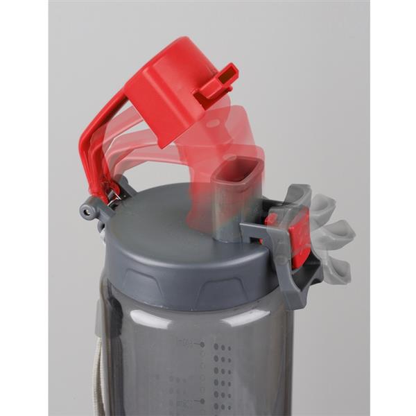 Bidon 700 ml wykonany z tritanu, wytrzymałego i przejrzystego tworzywa niezawierającego BPA. Bidon posiada miarkę, uchwyt na nadgarstek, funkcję podwójnego zabezpieczenia przed wylaniem wody – przycisk i haczyk. Co istotne, jest łatwy w myciu.