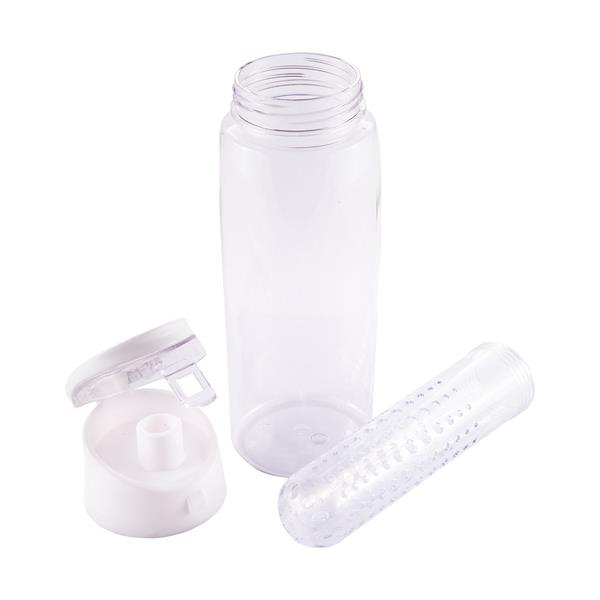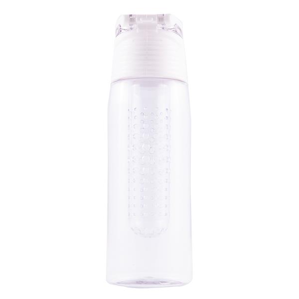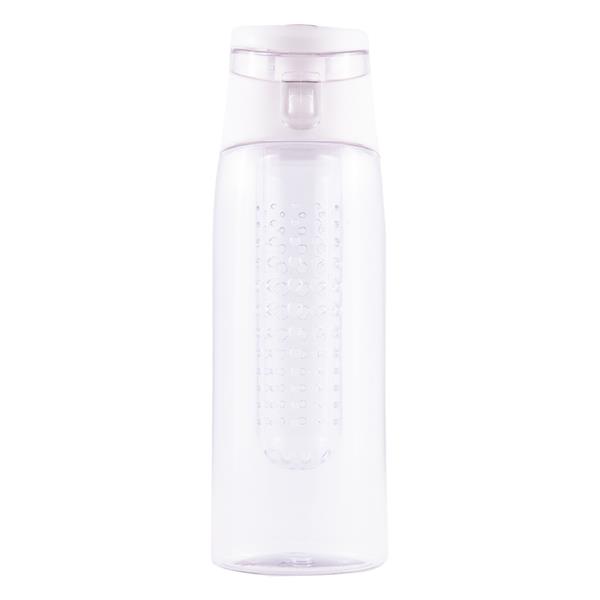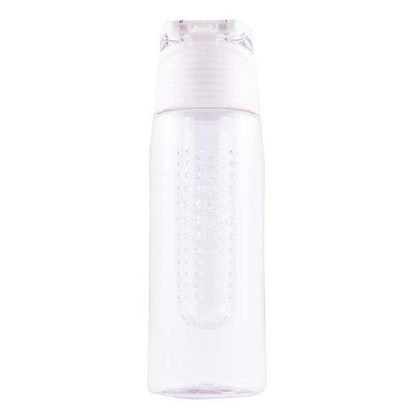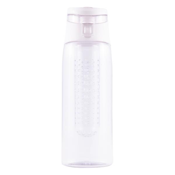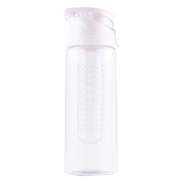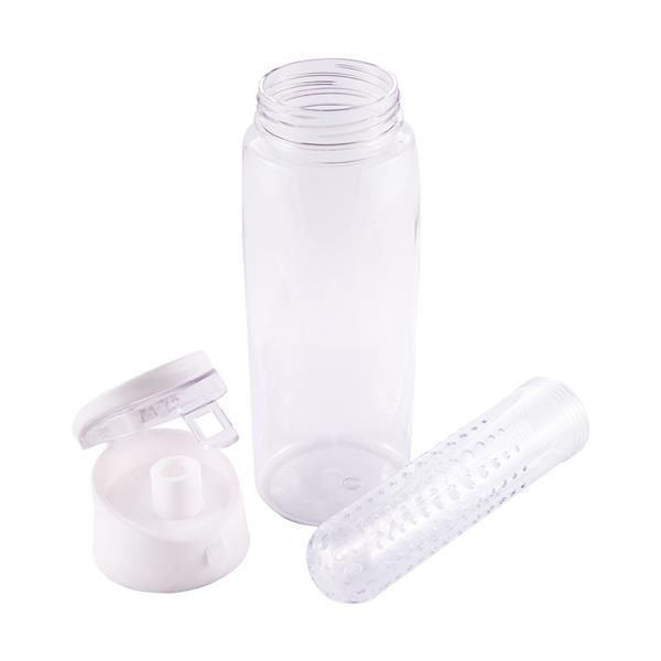 Lekki, szczelny bidon z solidnym zamknięciem, wyposażony w pojemnik na kawałki owoców lub miętę. Wykonany z tritanu – wytrzymałego, przezroczystego tworzywa niezmieniającego smaku napoju. Wolny od BPA.