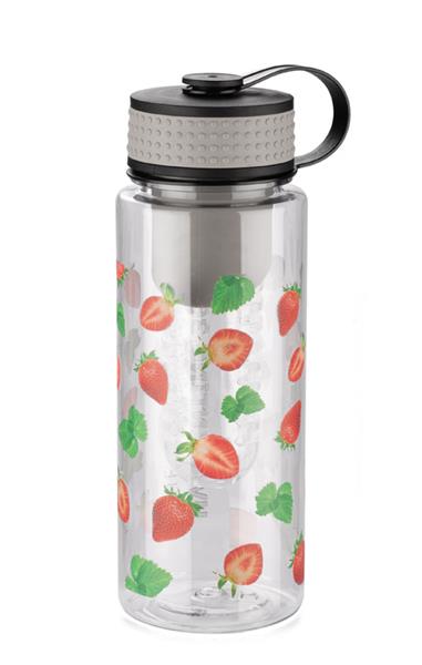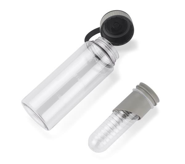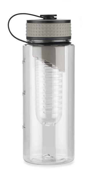 Bidon posiadający wkład na owoce. Pojemność 800 ml. Wykonany z tritanu. Zapakowany w woreczek biodegradowalny.