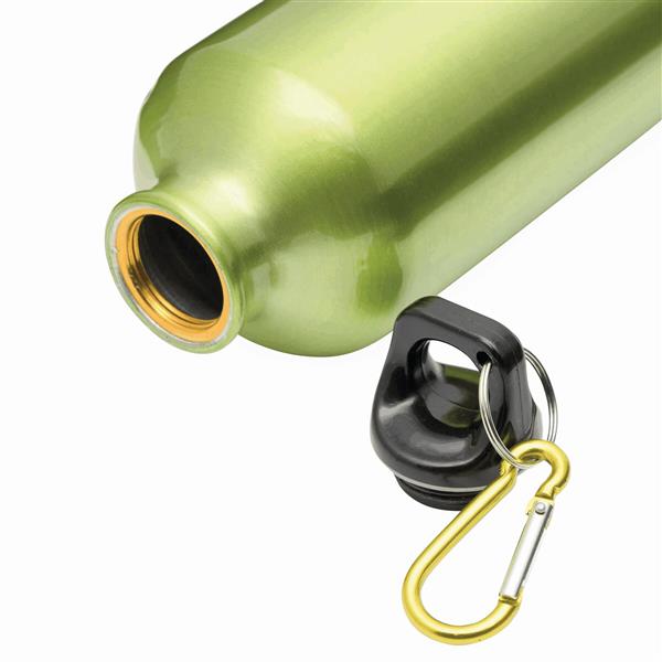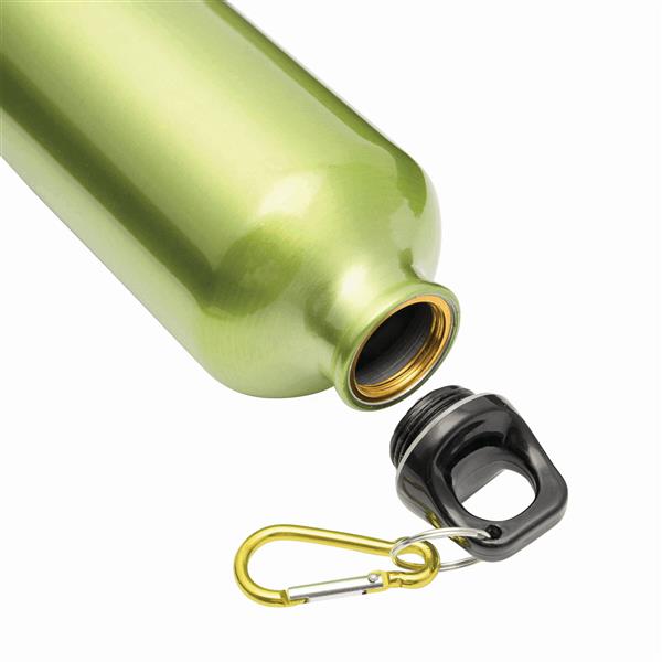 Aluminiowy bidon BIG TRANSIT z plastikową pokrywą z dopasowanym kolorystycznie karabińczykiem. Pojemność ok. 750 ml.