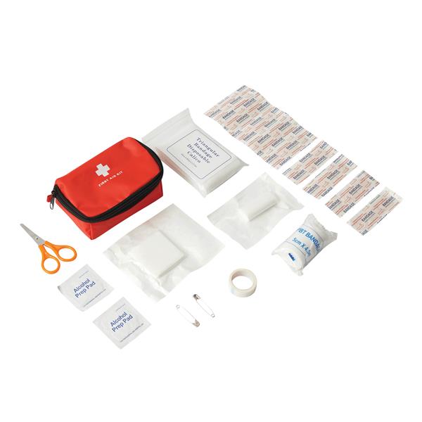 Apteczka pierwszej pomocy BIGGUARD, 20 elementów: zawiera 1 parę małych nożyczek, 9 plastrów samoprzylepnych, 1 bandaż PBT, 1 rolkę taśmy samoprzylepnej, 1 bandaż gazowy, 2 waciki nasączone alkoholem, 1 opakowanie gazików, 1 chustę trójkątną, 2 agrafki, zapakowana w nylonową torbę z zamkiem błyskawicznym.