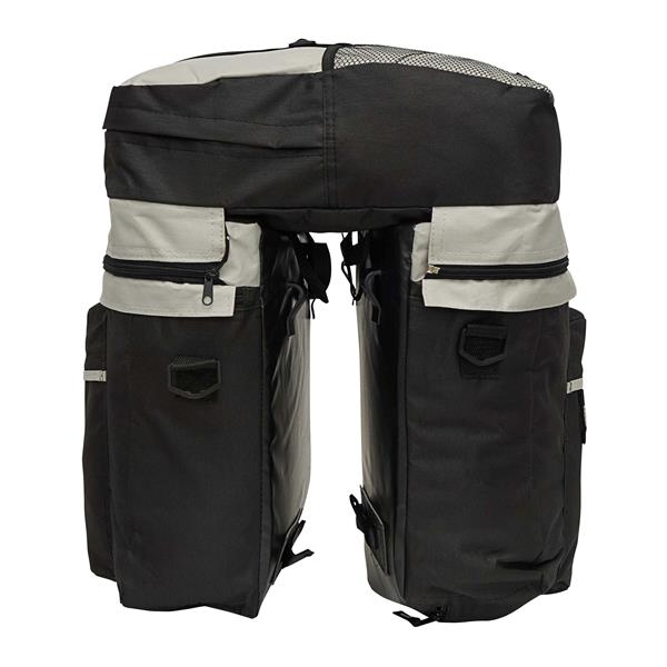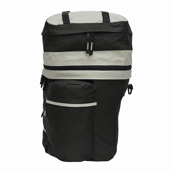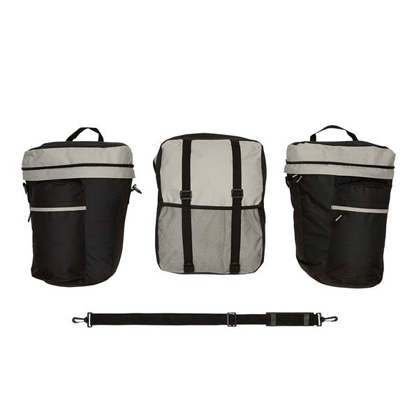 Komplet bagażowy na rower BIKE, 3-częściowy komplet zawierający 2 boczne torby z odblaskami, zamykane na zamki błyskawiczne, z osłoną przeciwdeszczową, plecak z regulowanymi paskami na ramiona. Materiał: 600D Poliester Kolor: czarny, szary Tagi: Torby,akcesoria rowerowe,artykuły rekreacyjne,artykuły sportowe,outdoor,torby rowerowe