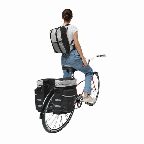 Komplet bagażowy na rower BIKE, 3-częściowy komplet zawierający 2 boczne torby z odblaskami, zamykane na zamki błyskawiczne, z osłoną przeciwdeszczową, plecak z regulowanymi paskami na ramiona.