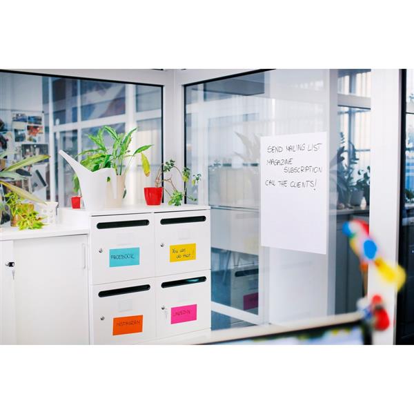 Blok elektrostatycznych kartek samoprzylepnych wielokrotnego użytku, format ok. B3, 25 arkuszy, dzięki ładunkowi elektrostatycznemu przylega do gładkich powierzchni, nie wymaga kleju ani magnesów i nie pozostawia śladów, nadaje się do stosowania w pionie i w poziomie, możliwość pisania markerami, długopisami i ołówkami, może przydać się w biurze, szkole oraz podczas szkoleń i prezentacji, produkt wykonany z papieru oraz folii PP. Wyprodukowany w Europie.