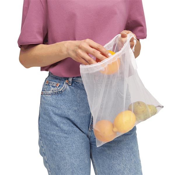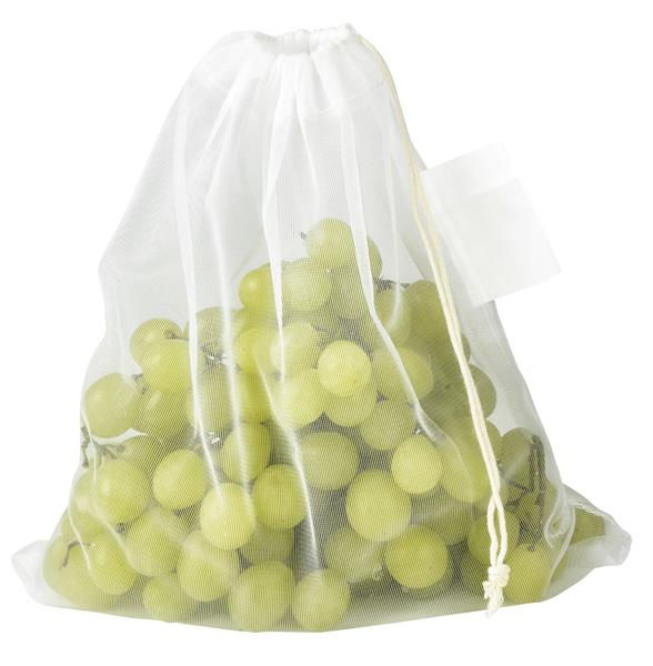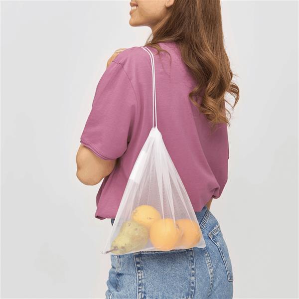 Siatka na owoce i warzywa BLUE PLANET z materiałów pochodzących z recyklingu, zamykana ściągaczem, do prania, wielokrotnego użytku, z metką do druku. Materiał: RPET Kolor: biały Tagi: Torby na zakupy,artykuły gospodarstwa domowego,shoppery,torby,siatki na warzywa