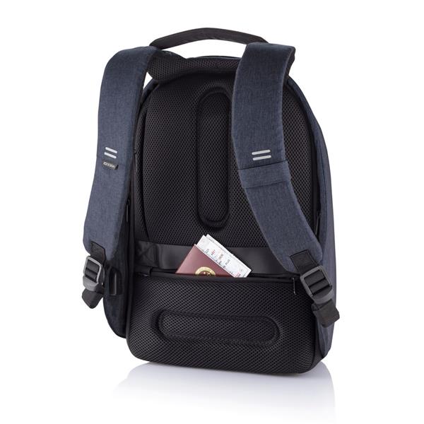 Plecak chroniący przed kieszonkowcami Bobby Hero Small, wodoodporny i odporny na przecięcia materiał, wykonany z przyjaznego środowisku materiału RPET, ukryte zamki i kieszenie, wewnątrz miękkie przegrody na laptopa do 13,3″ i tablet do 12,9″, zintegrowany port USB do ładowania telefonów (power-bank nie jest dołączony), odblaskowe paski zwiększające widoczność, pasek do zamocowania na walizce, wzór zastrzeżony®, ślad węglowy produktu: 6,28 kg CO2